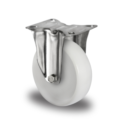 Mit verschleißfester, geräuscharmer Polyamid-Bereifung. Nabe mit wartungsfreiem Edestahlgleitlager. Das stoßunempfindliche und korrosionsbeständige Lager ist optimal geeignet für den Einsatz bei niedrigen Geschwindigkeiten. Felge aus Polyamid. Gehäuse aus Stahl. Befestigung mit Platte.