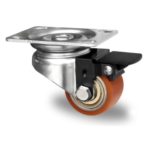 Mit hoch belastbarer, geräuscharmer Polyurethan-Bereifung. Nabe mit Schwenklager. Dadurch wird eine 360°-Drehung ermöglicht. Schraubloch Abstand 75/61x51/45 mm. Der Totalfeststeller sorgt dafür, dass durch Betätigung eines Hebels die Rad- und Schwenkbewegung des Drehkranzes blockiert wird. Felge aus rostfreier Stahl. Felge ohne Fadenschutz. Gehäuse aus Stahl galvanisch verzinkt. Befestigung mit Platte.