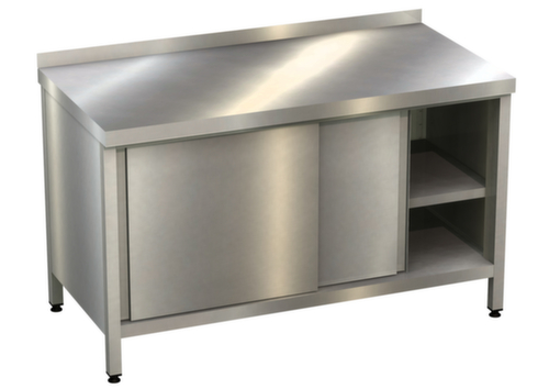 "description": "HxBxT 900x2000x700mm, Edelstahlplatte, 4-Fuß, Ausstattung: Ablageboden, Schiebetür",