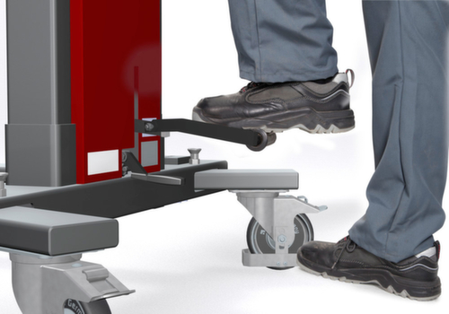 "description": "Tragl. 300kg, Greifsystem m. Prismenbacken, Fahrgestell breit, Lenkräder PU, Hub H 0-930mm, Stahl, rot, Bedienung Hub manuell über Fußpedal",