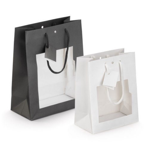"longDescription": "<h2>Sacs en papier avec fenêtre noire 180 x 190 x 80 mm</h2><p>Avec ce sac en papier chic en blanc ou noir avec fenêtre, vous pouvez présenter de manière idéale et attrayante de petits produits comme des cadeaux cosmétiques ou d'épicerie fine. La fenêtre est carrée et permet de voir l'intérieur. Le sac de transport est en papier mat et dispose d'une carte de vœux sur le cordon en coton. Le cordon est assorti à la couleur du sac, en blanc sobre ou en noir. Le fond et les soufflets latéraux permettent de le remplir et de le mettre en place facilement. Utilisez la carte de vœux intégrée pour laisser un message personnalisé ou inscrire le nom du destinataire. Le fond en bloc stabilise ce cabas et les cordons en coton donnent à cet élégant cabas en papier ce petit quelque chose en plus.Tous les détails en un coup d'œil : - Avec cordons en coton- Fond en bloc renforcé par du carton- Avec soufflets latéraux et de fond pour un remplissage facile- Couleur : blanc ou noir- Intérieur : blanc- Matériau : 100% papier, fenêtre transparente fenêtre transparente en RPET- Qualité : 157 g/m²- Unité d'emballage (UE) : 10 ou 25 sacsSi le contenu doit rester caché, RAJA vous propose également une boîte en carton stable avec couvercle pour présenter de petits cadeaux. Vous préférez les sacs en papier avec impression ? Alors vous êtes également à la bonne adresse chez nous !</p><br>",