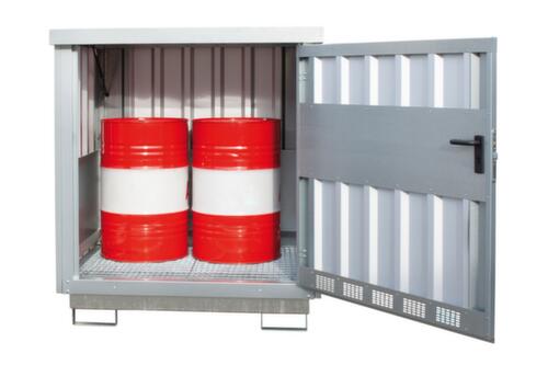 "description": "p. substances danger./combustibles, HxlxP 1710x1535x1590mm, p. fût 4x200l, de tablette de rétention av. caillebotis, fourreaux pour fourche",