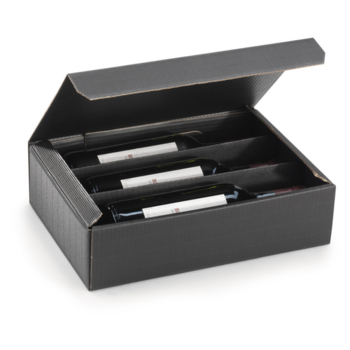 "longDescription": "<h2>Carton cadeau 3 bouteilles noir</h2><p>Les cartons cadeaux pour bouteilles sont l'alternative stable aux sacs de transport : ils offrent une protection optimale grâce à des séparateurs et une stabilité particulière au niveau du col des bouteilles. Grâce à l'emballage stable pour bouteilles en micro-ondes, vos bouteilles passeront le transport sans dommage, c'est garanti. Les couleurs attrayantes et sobres de la boîte cadeau sont intemporelles et conviennent à presque toutes les occasions.Tous les détails en un coup d'œil : - Protection optimale grâce aux séparateurs dans le carton- Couvercle à charnière avec languette de fermeture pour une fermeture facile- Stabilité particulière au niveau du col des bouteilles- Grand choix grâce aux 3 tailles (pour une, deux ou trois bouteilles)- Carton cadeau disponible en deux couleurs : rouge et brun- Livraison à plat- Matériau : carton solide, micro-onduléDécouvrez également la laine de bois. Celle-ci complète parfaitement l'image et protège en plus le contenu.</p><br>",