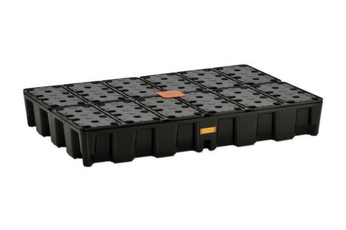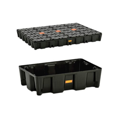 "description": "p. bidons, vol. rétention 250l, HxlxP 180x1600x1200mm, av. plaque perf. PE, tablette lisse",