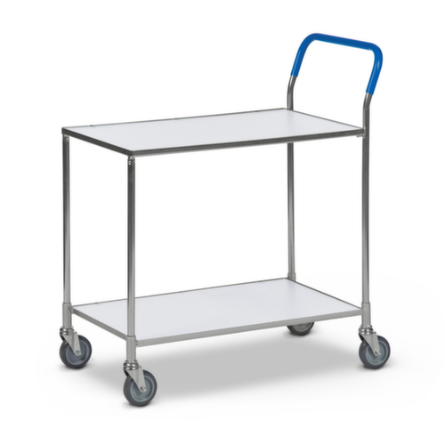 "longDescription": "<h2>Chariot de service en acier avec poignée en plastique</h2><p>Le chariot de service en acier est une aide pratique dans votre entreprise, que ce soit dans l'entrepôt, le bureau ou le service. Avec sa construction robuste et sa grande capacité de charge, il est idéal pour le transport d'objets lourds. Chariot de service avec poignée confortable et grande charge utile La poignée entourée de plastique assure une prise en main confortable et sûre, même par basses températures. Ainsi, vous êtes non seulement protégé des mains froides, mais vous profitez également d'un confort d'utilisation accru. Les deux niveaux offrent une charge utile totale de 150 kg (75 kg par niveau), ce qui permet de transporter sans problème des charges lourdes. Dimensions pratiques et roues faciles à manœuvrer Avec ses dimensions de 95 x 43,5 x 85 cm et une distance de 51 cm entre les niveaux, le chariot de service offre suffisamment de place pour différents objets. Les quatre roues en plastique d'un diamètre de 10 cm permettent de le manœuvrer facilement, même sur un sol inégal. Stabilité et flexibilité Le chariot de service est en acier robuste et pèse 13,5 kg, ce qui lui confère une stabilité supplémentaire. Malgré sa construction stable, il est facile à déplacer et à utiliser de manière flexible grâce à ses roues faciles à manœuvrer. En plus de l'aide au transport, vous avez besoin de solutions pratiques pour le rangement et l'entreposage ? Chez RAJA, vous trouverez une multitude de boîtes de rangement, avec ou sans couvercle, colorées ou transparentes.</p><br>",