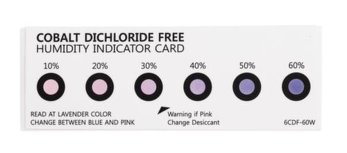 "longDescription": "<h2>Indicateur d’humidité</h2><ul><li>Pour le transport de produits sensibles à l’humidité, par ex. appareils électroniques, instruments optiques ou métaux</li><li>Sans chlorure de cobalt II</li><li>Zones d’affichage 10 %, 20 %, 30 %, 40 %, 50 % et 60 %</li></ul><h3>Application :</h3><ul><li>Placer l’indicateur à l’intérieur de l’emballage</li><li>Lorsque l’humidité de l’air augmente, la couleur vire du bleu au violet, puis au rose</li><li>Les chiffres dans les cercles indiquent l’humidité relative</li><li>L’agent siccatif fait baisser l’humidité relative sous les 20 %, l’indicateur doit donc être bleu (30 %)</li></ul>",