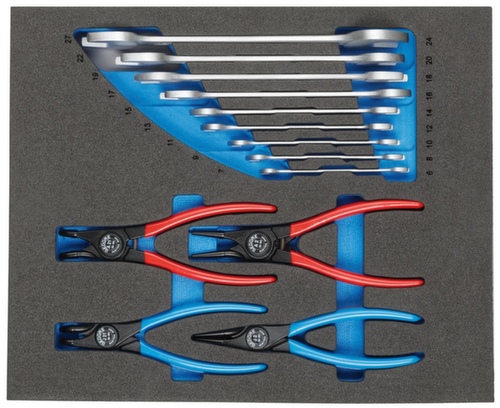 "longDescription": "Dimensions : 316,5 x 390 x 35 mm, Contrôle visuel simple de l'intégralité grâce aux inserts en mousse bicolores, Particulièrement adapté aux travaux dans des zones sensibles où il faut s'assurer qu'aucun outil n'est laissé derrière, support bleu, support noir. La couleur bleue signale les outils manquants, L'outil repose dans son nid sans glisser et est protégé contre les dommages, Les poignées encastrées facilitent le retrait de l'outil, Les contours clairement visibles des outils facilitent leur remise dans le bon nid, Résistant aux huiles et aux graisses, Facile à nettoyer avec de l'eau, du savon et une brosse à main/à ongles<br>",