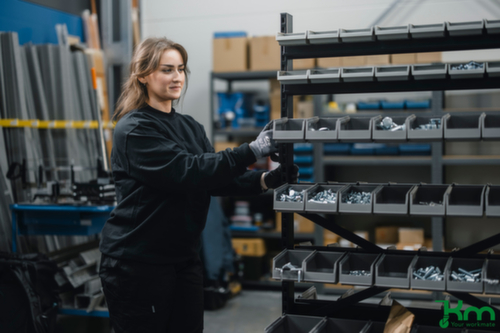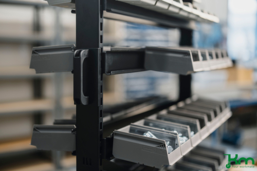 avec rails de suspension. utilisation bilatéral - exploitation optimale de l’espace et plus d’espace de rangement, car installation libre dans la pièce. Avec 14 rails à hauteur réglable pour le logement des bacs. structure en noir. Manœuvre et déplacement aisés grâce à 4 roulettes pivotantes. Les freins situés sur deux roulettes pivotantes offrent la stabilité souhaitée à tout moment. volume de livraison : sans bacs.
