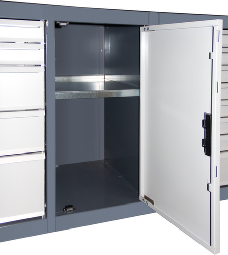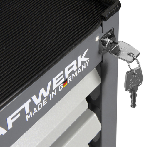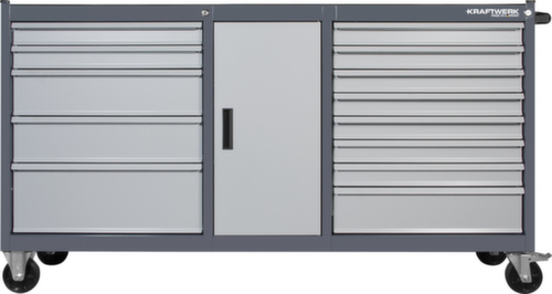 Avec 13 tiroirs, le chariot à outils offre suffisamment d’espace de rangement pour que vos outils soient toujours bien rangés et directement accessibles. Grâce aux glissières télescopiques à billes, les bacs s’ouvrent et se ferment très facilement, même en cas de charge élevée. L’extension totale permet un accès facile à 100% dans tous les coins. Tous les tiroirs sont dotés d'une poignée barre sur toute la largeur qui en facilite l'accès depuis n'importe quel angle au quotidien. Pour que votre KRAFTWERK® chariot d’atelier ne se renverse pas, le dispositif de blocage individuel empêche l’ouverture simultanée de plusieurs tiroirs. corps avec porte battante simple. 1 niveaux.