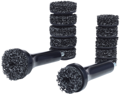 "longDescription": "pour un nettoyage optimal des moyeux de roue et des disques de frein, idéal pour une utilisation sur les moyeux de roue des voitures particulières, des fourgonnettes et des monospaces avec des goujons jusqu'à Ø 40 ou Ø 50 mm de diamètre, disque de meulage avec un support de 10 mm avec 3 surfaces de contact, pour une utilisation avec des perceuses et des tournevis sans fil (vitesse max. 1.500 tr/min), fermeture velcro pour un changement rapide du disque de nettoyage, pas d'étincelles volantes, faible usure - durée de vie maximale (environ 50 véhicules par disque), empêche la falsification des couples de serrage des roues grâce à des surfaces de contact propres, formation minimale de poussière grâce à l'abrasif à pores ouverts et au disque abrasif en forme de pot.<br>",