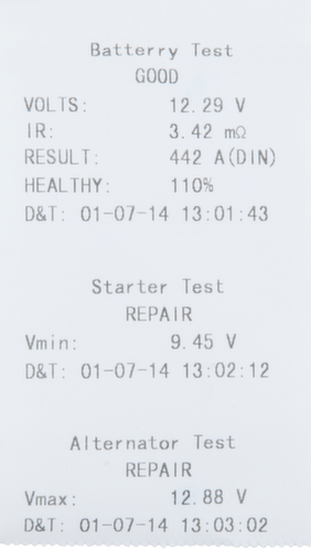 "longDescription": "convient aux batteries de 12 volts (plomb-acide, gel, cellule humide, MF, VRLA, calcium, AGM et batteries à cycle profond), fonctionnement intuitif guidé par menu, avec imprimante thermique intégrée, contrôle automatique de la procédure de test complète par navigation dans le menu, pour une détermination rapide et facile des performances de la batterie en tenant compte de la compensation de température, vérifie l'état de la batterie, l'état de charge, la résistance interne, la valeur du courant de démarrage à froid, l'évaluation de la batterie est effectuée rapidement et précisément par le protocole de pression, avec fonction de contrôle pour la mesure de la batterie de démarrage, du moteur de démarrage et du circuit de charge, le rapport de test soutient l'argumentation vis-à-vis du client de l'atelier, le raccordement à la batterie s'effectue par deux bornes à pôle crocodile gainées de plastique, évite de surcharger la batterie par une mesure trop longue, affichage numérique éclairé et très facile à lire, le câble de 0,43 m de long permet un travail flexible, rouleau de papier thermique inclus, boîtier en coque de caoutchouc résistant.<br>",