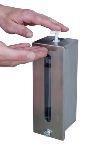 convient pour pour tous les désinfectants (contenant de l'alcool), savon liquide et savon crème, lotions et liquides similaires. avec indicateur de niveau de remplissage, serrure. verrouillable avec serrure de sécurité. en acier inoxydable.