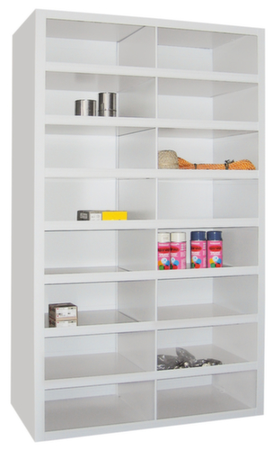 16 compartiments offrent un espace de rangement suffisant pour stocker et trier par ex. des papiers, consommables ou pièces de rechange. 2 compartiments par niveau. compartiments avec rebord antichute (40 mm) et porte-étiquette intégré. construction en tôle d'acier avec finition époxy résistante aux chocs et aux rayures. corps en RAL7035 gris clair. niveaux en RAL7035 gris clair.