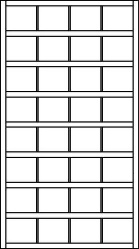 32 compartiments offrent un espace de rangement suffisant pour stocker et trier par ex. des papiers, consommables ou pièces de rechange. 4 compartiments par niveau. compartiments avec rebord antichute (40 mm) et porte-étiquette intégré. construction en tôle d'acier avec finition époxy résistante aux chocs et aux rayures. corps en RAL7035 gris clair. niveaux en RAL7035 gris clair.