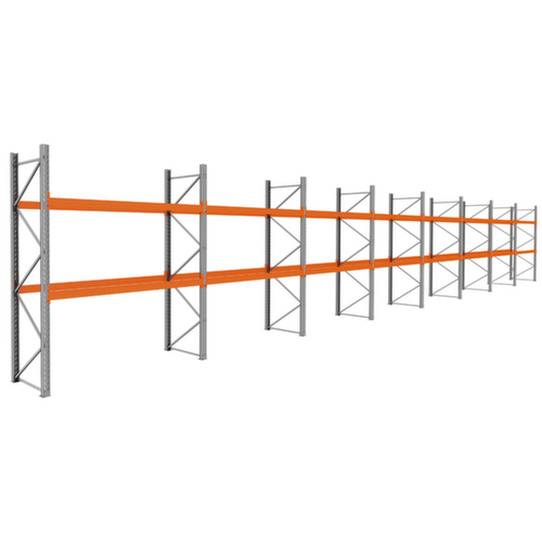 Les principales dimensions du rayonnage à palettes en un coup d'œil :8 éléments standard avec chacun 2 niveau(x) avec traverses offrent une capacité de stockage pour 72 palettes au total. hauteurs de compartiments réglables par pas de 70 mm selon l’usage prévu et vos besoins. Chaque élément standard offre 9 emplacements pour palettes (stockage du sol incl.). entreposage longitudinal. Les traverses longitudinales sont accrochées à l'échelle à l'aide de mâchoires à trois crochets et d'une sécurité antidécrochage. utilisation unilatéral - conçu pour un montage mural. grande stabilité grâce aux supports de tablette avec profilés en caisson fermés. structure en acier. montants avec revêtement en zinc anti-corrosion. niveaux en RAL2004 orangé pur.