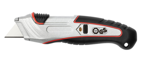 "longDescription": "<h2>Safety Cutter</h2><strong>avec rétractation de lame automatique</strong><br><ul><li>Convient pour droitiers et gauchers</li><li>Poignée en métal ergonomique antidérapante</li><li>Lame montée sur ressort avec rétractation de lame automatique dès qu'elle n'est plus en contact avec l'objet à couper</li><li>Avec roue de réglage, 3 niveaux de profondeur de coupe sélectionnables : 9 mm, 15 mm et 25 mm</li><li>Changement de lame facile avec verrou de sécurité</li><li>Avec trou de suspension</li></ul><br><h3>Livraison :</h3><ul><li>5 lames de rechange trapézoïdales en acier au carbone SK5 incl.</li></ul><br>Label de contrôle / Contrôlé conformément à :<br>Label GS - Certification TÜV<br>",