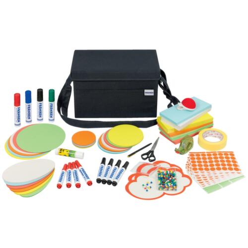 "longDescription": "<h2>Franken Moderationstasche</h2><h3>praktischer Helfer im Moderationsbereich</h3><p>Perfekt für mobile Trainer und Moderatoren für die Durchführung von Seminaren, Präsentationen, Workshops oder Schulungen. Die lückenlose Moderationsausstattung unterstützt aber nicht nur bei der Präsentation selbst, sondern kann schon in der Vorbereitung inspirieren und helfen eine Grundstruktur der Moderation zu entwickeln. </p><strong>Wichtige Details und Merkmale der Franken Präsentationsausstattung</strong><ul><strong>Set bestehend aus:</strong> <ul><li>20 Mini-Moderationswolken, 14 x 23 cm</li><li> 500 Rechteckkarten, 9,5 x 20,5 cm</li><li> 200 Ovale, 11 x 19 cm</li><li> 200 Kreise, Ø 9,5 cm</li><li> 150 Kreise, Ø 14 cm</li><li> 150 Kreise, Ø 19,5 cm</li><li> je 520 Markierungspunkte in rot und grün</li><li> 8 FlipchartMarker, je 4 in schwarz und rot</li><li> 4 JumboMarker, je einer in rot, grün, blau und schwarz</li><li> 1 Kreppband</li><li> 1 Klebefilmabroller</li><li> 2 Klebestifte</li><li> 300 Pinnadeln mit Rundkopf</li><li> 1 Nadelkissen</li><li> 1 Zeigestab</li><li> 1 Schere</li><li> 1 Cutter</li></ul></ul><p>Die praktische Unterteilung ist herausnehm- und faltbar und bietet sicheren Halt und Übersicht für den gesamten Inhalt. Henkel. </p><li>Höhe x Breite x Tiefe 230 x 355 x 200 mm</li><li>In anthrazit</li>",