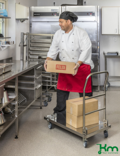Konstruktion aus Edelstahl. Plattform aus Edelstahl. Schiebebügel klappbar. Leicht zu manövrieren und verfahren durch 4 Lenkrollen, 2 Rollen mit Feststellern. Rad Ø 100 mm. Räder mit hoch belastbarer, geräuscharmer Polyurethan-Bereifung.