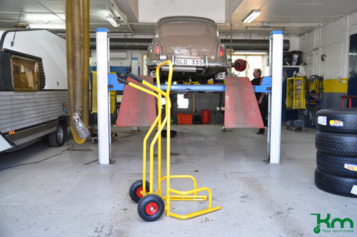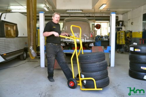 Die wichtigsten Maße der Kongamek Reifenkarre auf einen Blick:Konstruktion aus Stahlrohr. Gestell mit schlag- und kratzfester Pulverbeschichtung in gelb. Mit rutschfesten Handgriffen. Räder mit bodenschonender und geräuscharmer Luft-Bereifung. Rad Ø 260 mm.