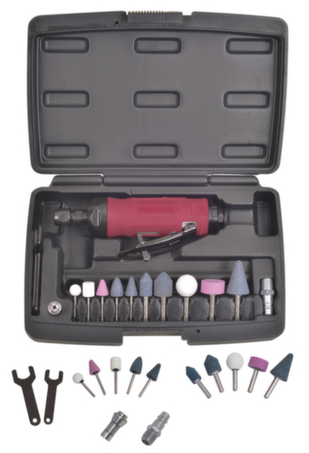"longDescription": "Mini-Luftschleifer-Set, 15 Stck. <br>- Zum Schleifen, Polieren und Entgraten<br>- Inkl. verschiedener Schleifsteine, zwei Spannzangen und Montagewerkzeug<br>- Gerades und kompaktes Design<br>- Für die Arbeit in schwierigen Bereichen<br>- Einhandbedienung<br>- Stufenlose Geschwindigkeitsregelung<br>- Kaltisolierter ergonomischer Griff <br>- Spannfutter: 3 oder 6 mm<br>- Geräuschleistungspegel: 80 dBA<br>- Empfohlener Arbeitsdruck: 6,3 bar (90 PSI)<br>- Empfohlener Schlauchdurchmesser: 3/8\" (10 mm)<br>- Gesamtlänge: 155 mm<br>- Gewicht: 0,4 kg<br><br>",