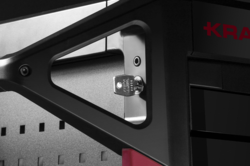 Der ergonomisch Schiebbügel im KRAFTWERK-Design erfüllt direkt zwei praktische Funktionen in Ihrem Arbeitsalltag. Zum einen sorgt er dafür, dass Sie den Werkstattwagen ganz einfach überall dort mit hinnehmen können, wo er gerade benötigt wird. Auch mit Handschuhen oder dreckigen Hänen, denn die Grifffläche ist extra rutschsicher. So ersparen Sie sich lästiges hin- und herlaufen, denn Ihr Werkzeug ist immer an der Arbeitsstation, wo Sie es gerade benötigen. Zum anderen schützt er durch das clevere Design aber auch das Zylinderschloss vor Verschmutzung oder gar einem Abbrechen des Schlüssels. Über das zentrale Schließsystem werden alle Frontschubladen gleichzeitig geschlossen und Ihr Werkzeug ist vor unbefugtem Zugriff sicher verstaut.