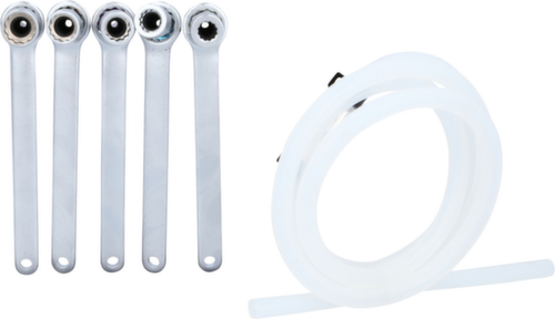 "longDescription": "<ul><li class=\"liste\">ideal einsetzbar für schwer zugängliche Stellen bei der Bremsentlüftung</li><li class=\"liste\">zur Bremsentlüftung ohne Demontage der Räder</li><li class=\"liste\">Silikon-Entlüfterschlauch (120 cm) bleibt beim Lösen und Festziehen auf Entlüfternippel</li><li class=\"liste\">mit Rückschlagventil, welches den Rückfluss alter Bremsflüssigkeit sowie ausgepumpter Luft verhindert</li><li class=\"liste\">auch zur Entlüftung von Kupplungssystemen geeignet</li><li class=\"liste\">farblich codiert nach Schlüsselweite</li><li class=\"liste\">extra kurze 12-kant Stecknüsse</li><li class=\"liste\">matt satiniert</li><li class=\"liste\">Chrom Vanadium</li></ul><br><br><strong>Enthaltene Teile:</strong><br>- 1 x Bremsen-Entlüftungsschlüssel, extra kurz, 7 mm, grün<br>- 1 x Bremsen-Entlüftungsschlüssel, extra kurz, 8 mm, blau<br>- 1 x Bremsen-Entlüftungsschlüssel, extra kurz, 9 mm, lila<br>- 1 x Bremsen-Entlüftungsschlüssel, extra kurz, 10 mm, gold<br>- 1 x Bremsen-Entlüftungsschlüssel, extra kurz, 11 mm, rot<br>- 1 x Silikonschlauch<br>",