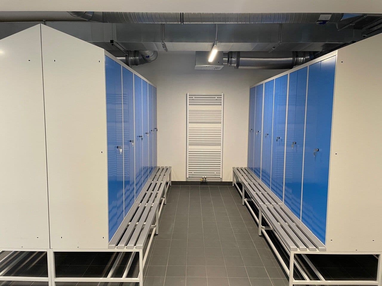 91 Garderobenspinde mit 4 Abteilen für 182 MA in Sonderausführung: mit Schrägdach, Sitzbank, Schließsystem und Inneneinrichtung