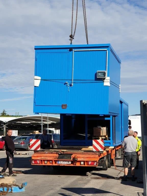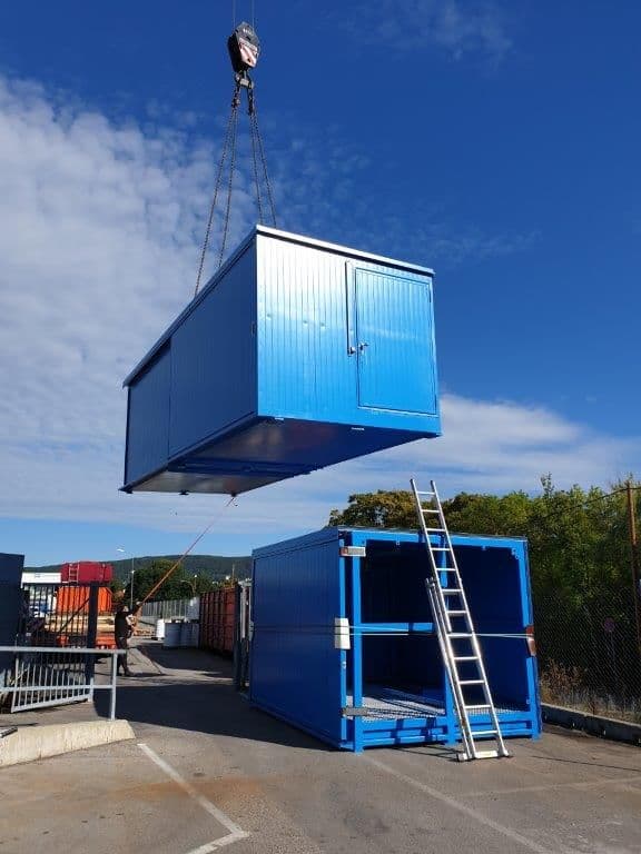 LaCont Wasserschutz-Fachcontainer, Auffangvolumen 6 x 550 Liter B x T x H 12.200 x 2.910 x 2.800 mm. Komfortabel und funktional ausgestattet mit: Heizlüfter, LED-Leuchten, Schaltkasten, Auffahrrampe und Kleingebinderegal.