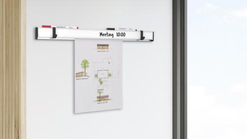 "longDescription": "<h2>Multifunktions-Klemmleiste MAULtalent</h2><strong>vereint 4 Funktionen an einer Stelle</strong><br><ul><li><strong>Universell einsetzbar</strong> im Büro, in der Werkstatt, in Fluren oder in der Küche</li><li><strong>Klemmleiste</strong> Papier von unten einfach einschieben, automatischer Halt durch Kunststoffröllchen</li><li><strong>Whiteboard</strong> - Frontseite magnethaftend, beschrift- und trocken abwischbar</li><li><strong>Aufhängung</strong> - 2 verschiebbare Haken, für z. B. leichte Jacken, Schlüssel oder Flipchartblöcke</li><li><strong>Ablage</strong> - Gerillt Oberseite als Stiftablage oder zum Aufstellen von Karten, Fotos oder Notizen</li></ul> - <strong>Mit Höhenausgleichsfunktion zum leichten Nachjustieren</strong> - inklusive Verlängerungsadapter und Montagematerial<br>",
