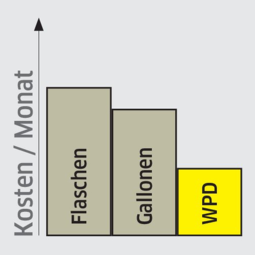 Klein, kompakt, platzsparend: Unser neuer Mittelklasse-Wasserspender WPD 50 Ws passt auch auf kleinsten Raum in Büros und Wartezimmern, im Einzelhandel und Hotellobbys. Wahlweise mit oder ohne Kohlensäure, versorgt das Gerät bis zu 25 Personen jederzeit mit gekühltem, frischem, hygienisch einwandfreiem Trinkwasser. Schädliche und den Geschmack des Wassers negativ beeinflussende Stoffe wie Chlor oder Schwermetalle und sogar Viren und Bakterien werden von unserem hochwirksamen Kombifilter zuverlässig zurückgehalten. Der Kombifilter, der aus einem Aktivkohle- und einem Ultrafilter besteht, sorgt so zuverlässig für frisches Wasser mit hervorragendem Geschmack. Für zusätzliche Sicherheit sorgt die Waterblock-Funktion. Die Reinigung erfolgt sicher und zuverlässig auf chemischem Weg mittels des mitgelieferten Injektor Reinigungskits mit Bevi Tabs Reinigungstabletten.