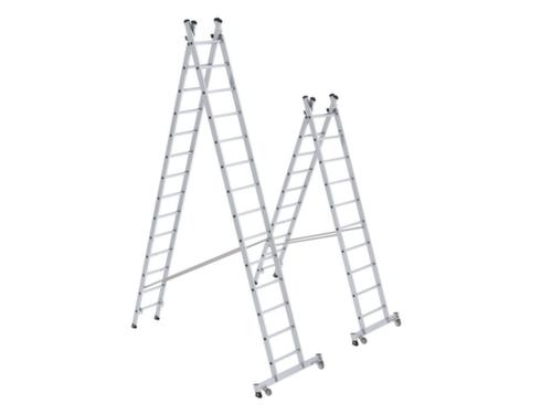 "longDescription": "<h2>Mehrzweck-Kombileiter</h2><strong>extra sicher dank nivello®-Traverse</strong><br><ul><li><strong>Universell einsetzbar</strong> - als Anlege-, Steh- und Schiebeleiter</li><li><strong>Unfallfreier Auf- und Abstieg</strong> - Sprossen mit rutschfester Riffelung</li><li><strong>Standsicherheit</strong> - mit Sicherheitsgurten als Spreizsicherung</li><li>Sprossen-Holm-Verbindungen gebördelt</li><li><strong>Langlebig und leicht</strong> - Holme aus Aluminium-Pressprofilen und Beschläge aus Stahl</li><li><strong>Extra standfest</strong> - breite nivello®-Traverse zum verschrauben und rutschsichere nivello®-Leiterschuhe</li></ul><br>Diese Mehrzweckleiter von Günzburger Steigtechnik ist ein wahres Kombinationstalet und ein Top-Angebot mit außerordentlichen Schutzmaßnahmen und einer Garantie von 15 Jahren. <br><br>Erhältlich ist sie als zweiteilige Ausführung, mit unterschiedlicher Sprossenanzahl und wahlweise mit oder ohne Transportrollen. Alle Varianten haben kräftige Holme aus Aluminium-Pressprofilen mit stabilen Stahl-Beschlägen und gebördelten Sprossen-Holm-Verbindungen. Die Vierkantsprossen sind rutschfest geriffelt, sodass ein sicherer Stand gegeben ist.<br><br>Die Mehrzweckleiter kann als beidseitig begehbare Steh- und Schiebeleiter oder auch als Anlegeleiter verwendet werden. Entscheidet man sich für die Leiter mit der Standardtraverse ist diese für den stationären Einsatz bestens geeignet. Die rollbare Traverse ermöglicht nicht nur den mobilen Einsatz und leichten Transport, sondern hat eine automatisch wirkende Abhebesicherung an der Oberleiter integriert. Diese verhindert das versehentliche zur Seite kippen oder auch nach hinten kippen, wenn die Leiter als Anlegeleiter in eine Dachrinne eingehängt wird. Zusätzlichen Schutz geben die zwei hochfesten Spanngurte, die als Spreizsicherung dienen. Jede Variante der Mehrzweckleiter ist mit breiten Traversen versehen, die zweifach an den unteren Holm-Enden verschraubt werden. Außerdem stehen die Holm-Enden auf rutschsicheren Leiterschuhen. Bei der mobilen Leiter ermöglichen die manuell mit wenigen Handgriffen umlegbaren Traversenrollen ein bequemes und rückenschonendes Verfahren der Leiter von Einsatzort zu Einsatzort. <br><br><strong>Qualitätsmerkmale!</strong><br><ul><li>Qualitätssicherung gemäß DIN EN 131</li><li>Entspr. DGUV 208-016 (ehemals BGI 694)</li><li>Entspr. BetrSichV TBRS 2121</li></ul>",