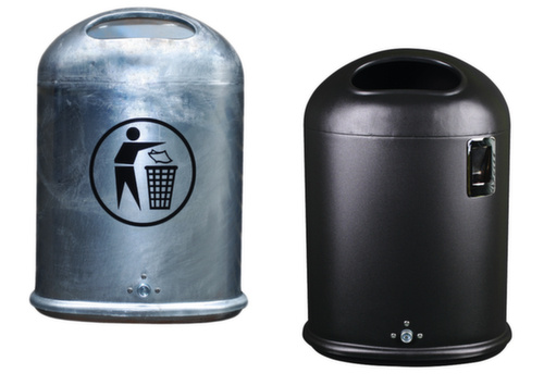 "longDescription": "<h2>Abfallbehälter</h2><strong>mit ovaler Einwurföffnung</strong><br><ul><li><strong>Robust und stabil</strong> - aus feuerverzinktem Stahlblech</li><li><strong>Einfache Entleerung</strong> durch verschließbare Bodenklappe</li><li>Lieferung inklusive Dreikatschlüssel</li></ul><br><h3>Sie haben die Wahl:</h3><ul><li><strong>Raucherfreundlich</strong> - wahlweise mit integriertem Ascher</li><li><strong>Offen oder veschlossen</strong> - Einwurföffnung wahlweise mit selbstschließender Klappe aus Edelstahl</li><li><strong>Langlebig oder auffällig</strong> - Oberfläche feuerverzinkt oder mit farbiger Pulverbeschichtung</li></ul><br><strong>Direkt mitbestellen:</strong><br><ul><li><strong>Passendes Befestigungsmaterial</strong> - Pfosten, Schellensets uvm.</li><li><strong>Gute Sichtbarkeit</strong> - Aufkleber \"Saubermännchen\"</li></ul><br>Dieser Mülleimer, wahlweise mit integriertem Aschenbecher, mit ovaler Einwurföffnung ist zur Wand- oder Pfostenmontage geeignet. Durch den verzinkten Stahl, wahlweise auch mit zusätzlicher Pulverbeschichtung in blau, schwarz oder grün, ist der 45 Liter- Abfalleimer robust und im Außenbereich einsetzbar.<br><br>Erhältlich ist der Abfallbehälter entweder mit einer normalen Öffnung oder mit einer selbstschließenden Federklappe um Gerüche zu vermeiden. Die Entleerung erfolgt durch verschließbare Bodenklappe, der Dreikantschlüssel aus Metall wird mitgeliefert.<br>",