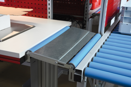 Mithilfe des Verbindungsbleches lassen sich Packtisch und Rollenbahn einfach miteinander verbinden und unterstützen somit am Arbeitsplatz.