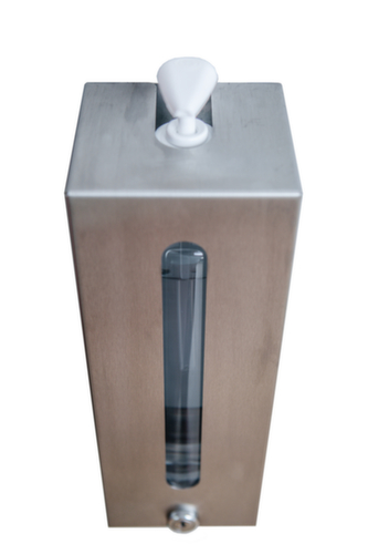 Geeignet für jegliche (alkoholhaltige) Desinfektionsmittel, Flüssig- und Cremeseife, Lotionen und ähnliche Flüssigkeiten. Mit Füllstandanzeige, Schloss. Verschließbar mit Sicherheitsschloss. Aus Edelstahl.